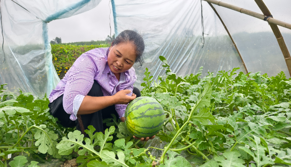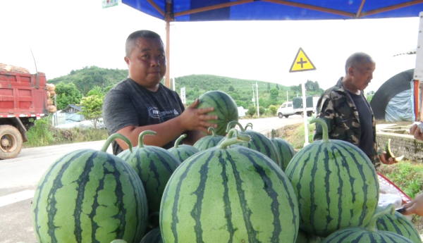 黔东南州丹寨县兴仁镇瓜农蒙阿者激动地说:“我们家西瓜出来了,一天卖七百斤、八百斤左右,我们批发去榕江、三都一天都批两三千斤,生意很好。”